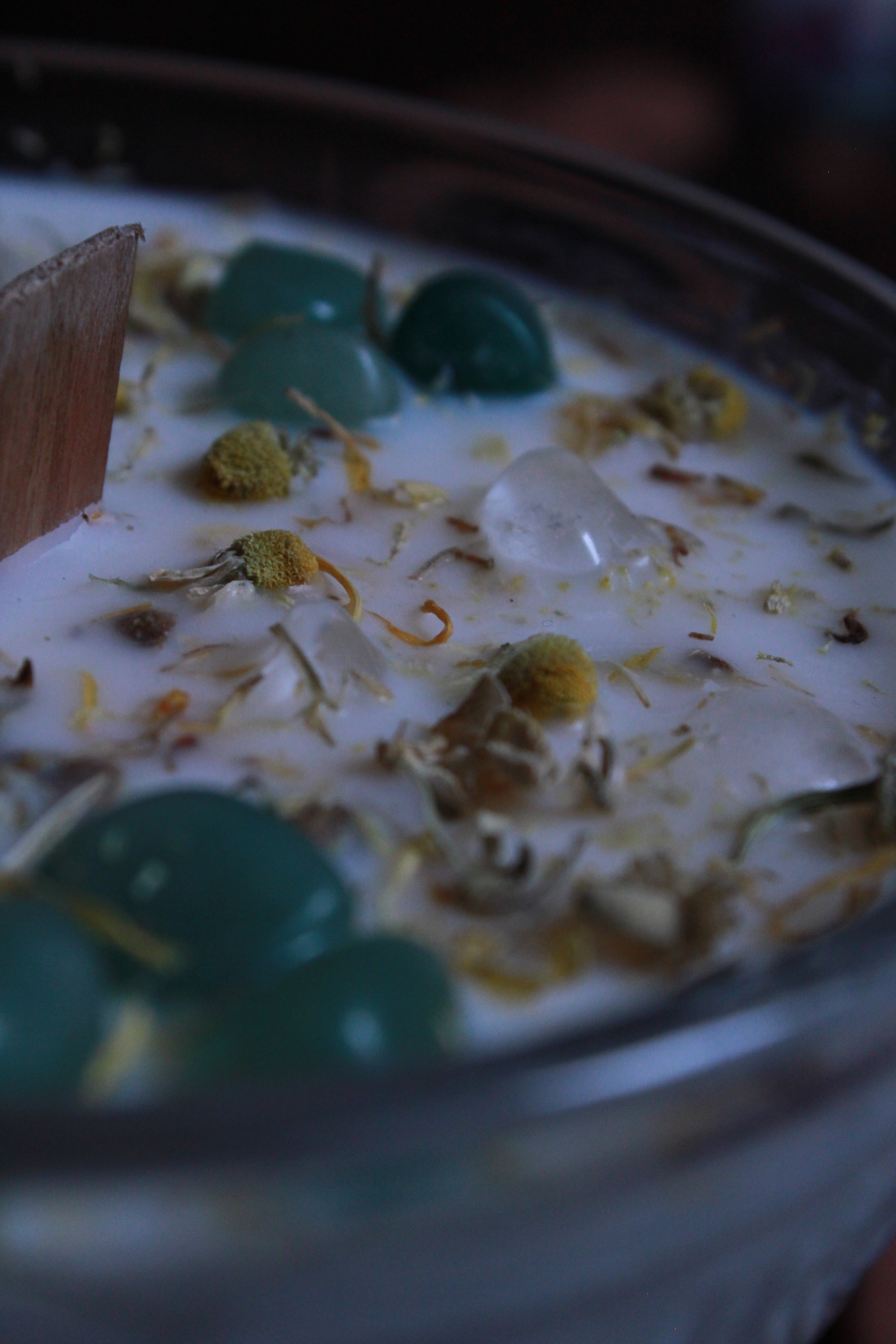 Très belles pierres! Difficiles de les retirer car bien incruster! Elles ne risquent pas de partir lors du transport haha! Le parfum de la bougie sent super bon! On me complimente souvent sur le fait que ca sent le gâteau!! Parfait et super parfum!
